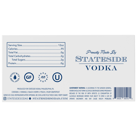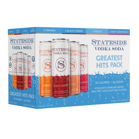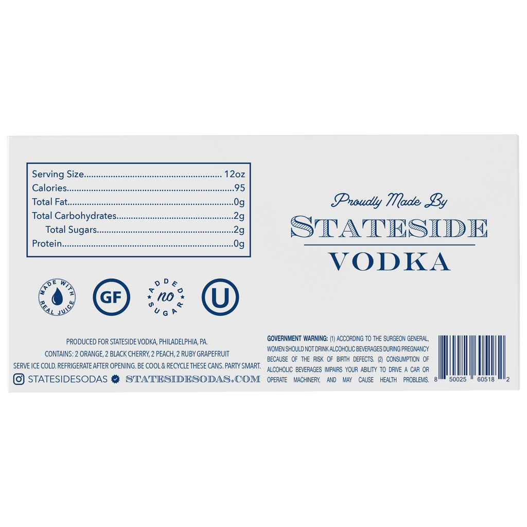 Each pack contains: 2 Orange, 2 Black Cherry, 2 Peach, and 2 Grapefruit Vodka Sodas a total of 8 cans per pack